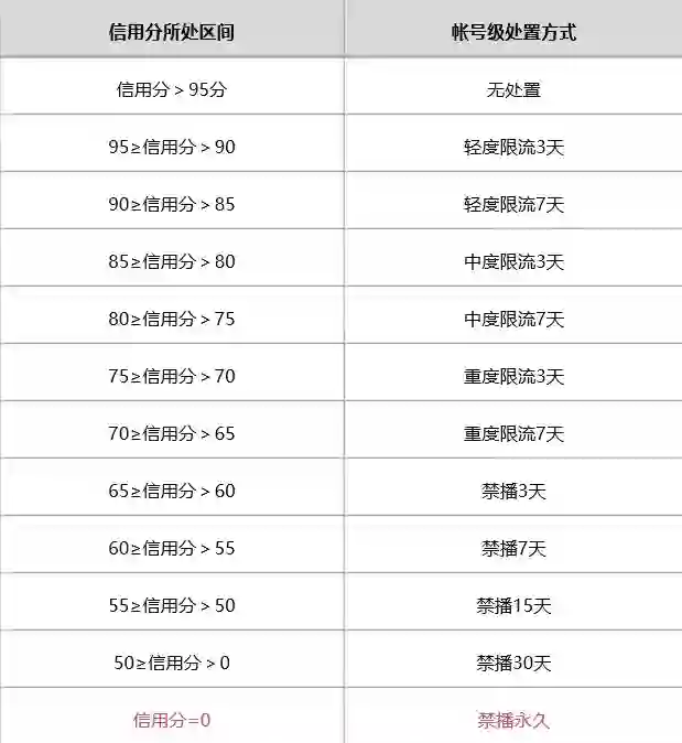 当信用分>95 分时,账号状态正常;当账号≤95 分时,将会触发信用分阶梯式的对应处罚。