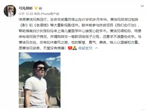 知名媒体人曹可凡也在社交媒体证实了廉洁去世的消息。3月29日中午,曹可凡发文悼念称:廉洁曾投资过包括《影》《老酒馆》等影视剧佳作,还曾匿名资助海南女孩前往上海接受心脏病手术。(21世纪经济报道)