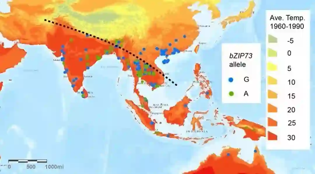 图2. 两种不同类型bZIP73在普通野生稻 (O. rufipogon)中的地理分布。蓝色和绿色圆点分别代表含粳稻型bZIP73 (G)和含籼稻型bZIP73 (A) 野生稻分布地区。热图显示的是从1960 – 1990年30年间平均地表温度(°C)。可以发现,含籼稻型bZIP73 (A) 野生稻主要分布区由虚线隔开,并与地表温度相关,说明粳稻型bZIP73与粳稻的北移具有明显的相关性。