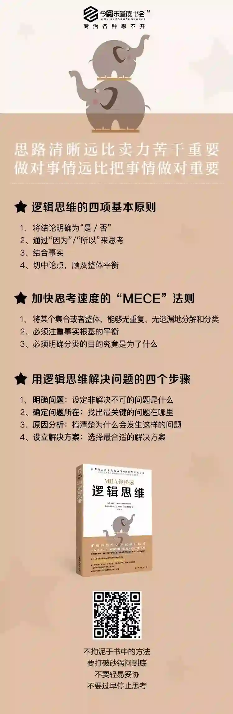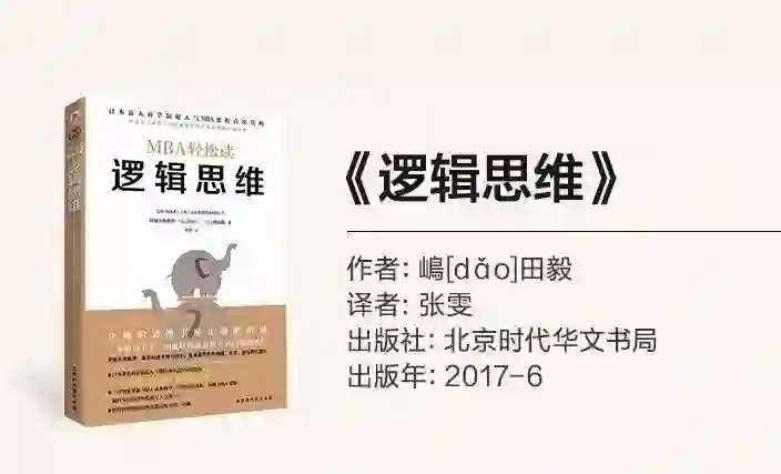 《逻辑思维》这本书是顾彼思商学院MBA课程的六门核心课之一,是根据作者的讲义编写而成的,里面的内容都是讲课中的精华。作者嶋田毅在书中指出,逻辑思维是商务人士必不可少的能力,在与对手谈判的时候如果没有良好的逻辑思维能力,就很可能会被对方掌控节奏和局面。《逻辑思维》这本书为我们提供了很多可执行的方法论,逻辑思维的精神告诉我们,不应拘泥于书中的方法,必须要有打破砂锅问到底的精神,不要轻易妥协,不要过早停止思考。