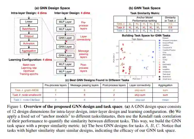 图神经网络(GNNs)的快速发展带来了越来越多的新架构和新应用。目前的研究侧重于提出和评估GNNs的具体架构设计,而不是研究GNNs的更一般的设计空间,后者由不同设计维度的笛卡尔积(如层数或聚合函数的类型)组成。此外,GNN设计通常专门针对单个任务,但很少有人努力了解如何快速为新任务或新数据集找到最佳GNN设计。这里我们定义并系统地研究了GNNs的架构设计空间,它包含了超过32种不同的预测任务的315000种不同的设计。我们的方法有三个主要创新:(1)一个通用的GNN设计空间;(2)具有相似度度量的GNN任务空间,这样对于给定的新任务/数据集,我们可以快速识别/传输性能最好的架构;(3)一种高效的设计空间评价方法,可以从大量的模型-任务组合中提取洞察力。我们的主要结果包括:(1)一套设计性能良好的GNN的全面指南;(2)虽然针对不同任务的最佳GNN设计存在显著差异,但GNN任务空间允许在不同任务之间传输最佳设计;(3)利用我们的设计空间发现的模型实现了最先进的性能。总的来说,我们的工作提供了一个原则性和可扩展性的方法,实现了从研究针对特定任务的个体GNN设计到系统地研究GNN设计空间和任务空间的过渡。最后,我们发布了GraphGym,这是一个用于探索不同GNN设计和任务的强大平台。GraphGym具有模块化的GNN实现、标准化的GNN评估和可重复和可扩展的实验管理。