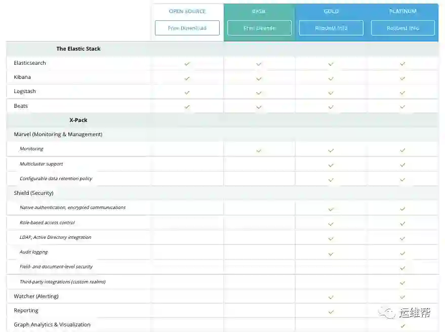 Elastic的基本组件都是开源的,参看下表,X-pack中的一些高级功能需要付费使用。包含安全,多集群,报表,监控等等。