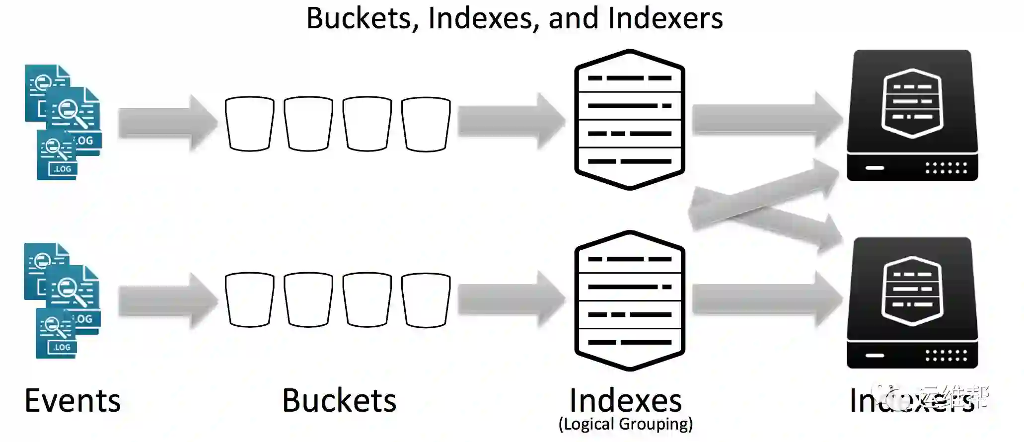 Splunk的Event存在许多Buckets中,多个Buckets构成逻辑分组的索引分布在Indexer上。