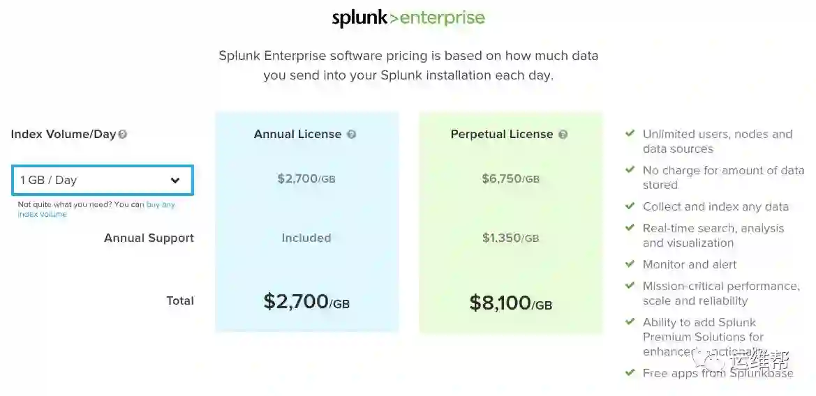 Splunk Enterprise是按照数据每日的流量按年或者无限制事件付费,每天1GB的话,每年是2700美元,每个月也是差不多200块。如果每天的数据量少于500M,可以使用Splunk提供的免费License,只是不能用安全,分布式等高级功能,500M可以做很多事情了。