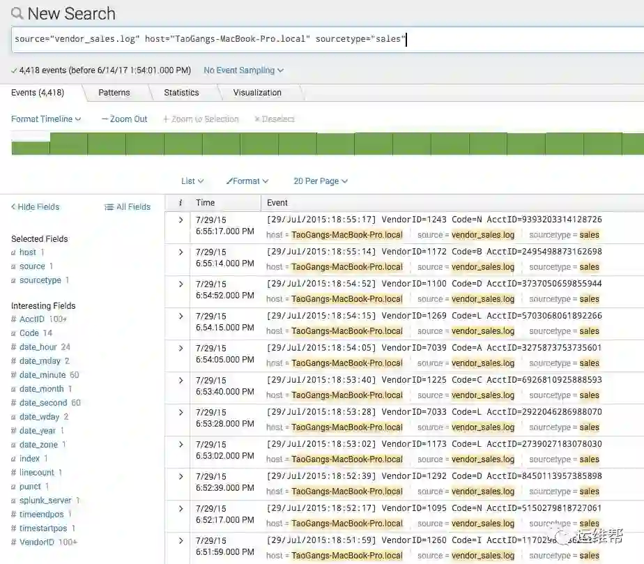 下图是一个Splunk的搜索在Splunk客户端看到的和前一个例子同样的日志数据的搜索结果。