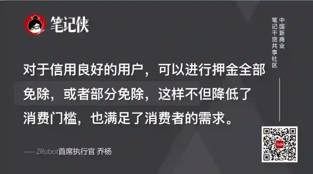 我们提出的概念是对于信用良好的用户,可以进行押金的全部免除,或者部分免除,这样不但降低了消费门槛,也满足了消费者的需求。