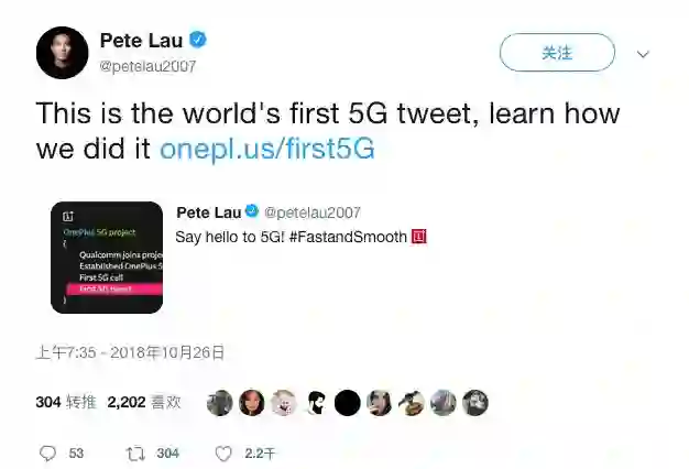 2018 年 8 月,一加更是在高通美国实验室成功连通了 5G;同年 10 月,一加 CEO 刘作虎发出了世界上第一条 5G 网络下的推特。