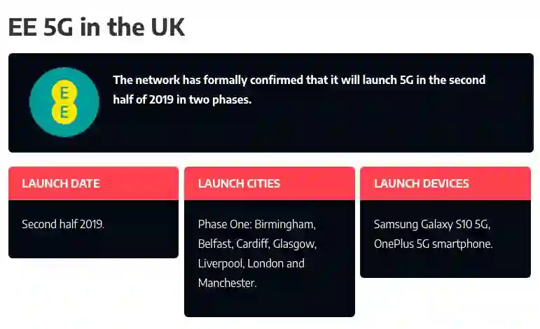 根据 EE 官方发布的 5G 网络进程,今年第二个季度会正式投入,伦敦、爱丁堡、伯明翰和曼彻斯特等部分城市开通 5G 网络,其中支持的手机设备就有一加手机,另一家就是三星了。