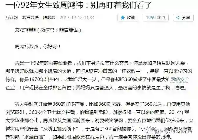 周鸿祎:我刚才讲的,这件事儿来的特别莫名其妙,昨天有很多朋友开始给我发了,开头我们还傻呵呵的以为有人想来碰一下瓷,按照过去的原则,你不管什么动机,你觉得我产品有问题,我该查就查,该改就改,把别人无论是谩骂还是攻击都变成产品改进的动力。昨天晚上感觉就不太对了,因为相当多的以这个为基础的造谣文章就开始出来了。而且今天早上公号推动就满屏都是了。所以,我在反思最近我到底得罪了谁呢?过去360的老冤家问了一圈,大家最近都跟我同框过,关系还可以,连人民呼唤周鸿祎的时候我都不愿意出来讲话,我想尽量低调一点儿。你可以说我现在,每个人都讲逻辑,我仔细看这篇文章,三色幼儿园的事儿出来以后我们说要让幼儿园家长可控。马上这位陈小姐先出了篇文章,那篇因为是造谣,意思360你可以看到,她所有的标题都打色情暗示,但是没啥影响力。然后又发了一篇。完全是针对我们在幼儿园做了这件事黑。他为啥死命打我免费?他造谣你到处免费送摄像头,换取直播内容。我刚才已经证明这是谣言了。