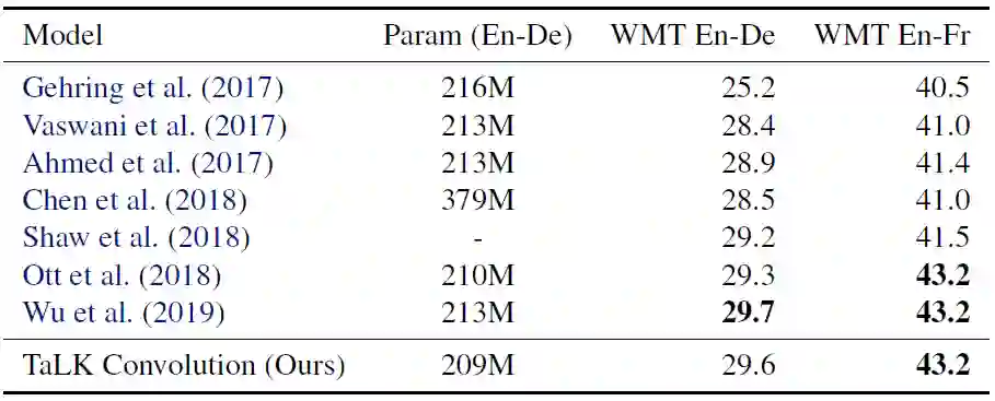 在WMT En-De, En-Fr和IWSLT De-En和WikiText-103上实现了和当前最优十分相近的结果。