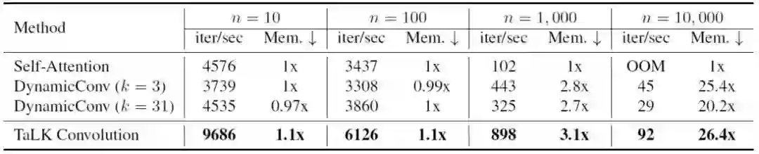 再看每秒迭代次数,在 n=10,100 的时候,本方法每秒迭代次数大概是自注意力和动态卷积的两倍。
