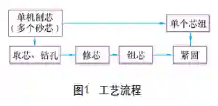以所生产的缸盖为例,其单个芯组重量达150kg,砂芯数量多达十几种,其工序包括单机制芯、取芯、修芯、组芯、紧固、浸涂及合芯等,工艺流程复杂,同时砂芯之间的配合精度要求高,生产节拍快。要想实现整个制芯工序的自动化生产就要“化整为零”,将整个制芯线分为多个制芯单元,先实现单个单元的自动化生产,然后通过“桥梁”将所有的单元联动,从而实现其自动化制芯流程。