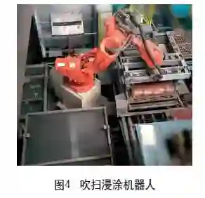 单个单元完成工作后形成多个砂芯的组合,配合轨道的输送,其他单元机器人的联动,逐步形成完整的芯组,整个流程又实现“由零化整”的过程。完整的芯组通过机器人全自动地进行整体的紧固(见图3)、吹扫浸涂(见图4)、组芯(见图5)操作,最终完成整个芯组的自动化生产。