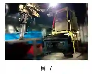 为此,在原有一台铸件夹取机械手(见图7)的前提下再次新增机械手,通过人的主动控制原则,操作使机械手模拟人手和臂展动作,代替繁重、环境恶劣的工作,同时还可以根据需要选择是否在机械手夹具上安装气锤装置来代替砸浇冒口的操作,从而实现铸件的流畅转运。