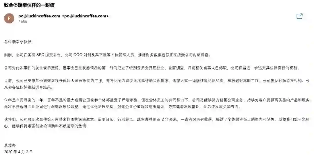 【瑞幸就涉嫌造假一事内部发文,收盘股价暴跌75%】瑞幸咖啡4月2日发布初步调查显示,从2019年第二季度到2019年第四季度虚假交易22亿元。开盘后,瑞幸咖啡股价就触发熔断机制,在20分钟内连续三次触发熔断。截至收盘,瑞幸咖啡共计在盘中六次暂停交易,股价暴跌逾75%。4月3日凌晨,瑞幸就涉嫌造假一事在内部发文称,公司对此次事件发生表示震惊,目前相关当事人已停职且其负责工作已安排其他管理者接任,并将尽力减少此次事件的负面影响。公司呼吁员工不忘初心,“道阻且长,行则将至 ”。