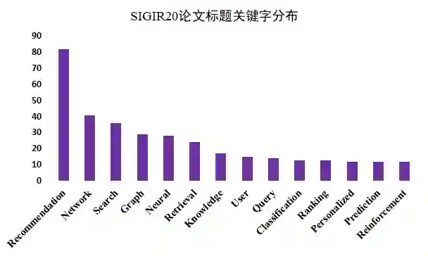 正因为推荐与搜索是解决信息过载的两种有效途径,因此虽然是关于检索的会议,但通过下图可以看出推荐(Recommendation)占据了很大比例,与搜索(Search+Retrieval)不相上下。另外,图与网络(Graph/Network)数据成为研究的主要对象,毕竟许多待研究的对象都可以表示为图。值得注意的是,神经网络(Neural)仍然排在前列;融合知识(Knowledge)的搜索/推荐系统也被许多研究者研究。除此之外,强化学习也出现在了排行榜中,可见利用强化学习的思想来迭代优化搜索/推荐逐渐成为流行。