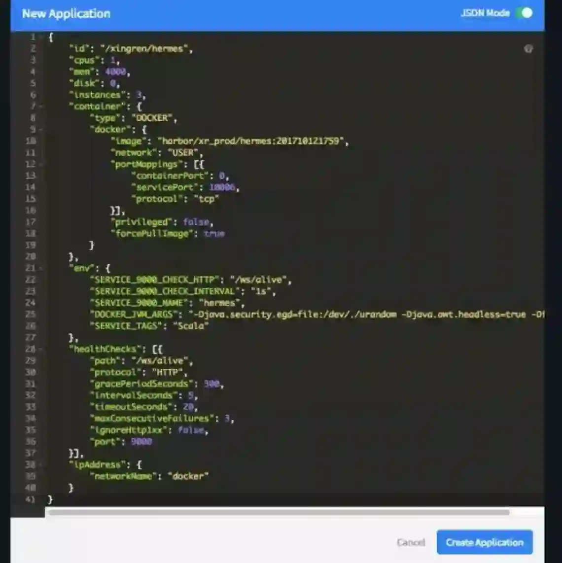 有了这套系统,我们创建应用、扩展应用就很简单了。创建应用时首先通过 Dockerfile 和 Jenkins 创建镜像,然后在 Marathon 界面上,只需要准备一个 Json 配置(也可以通过 Form 配置),指定资源、实例数、镜像、网络、健康检查、环境变量等,就可以很快上线一个新应用。