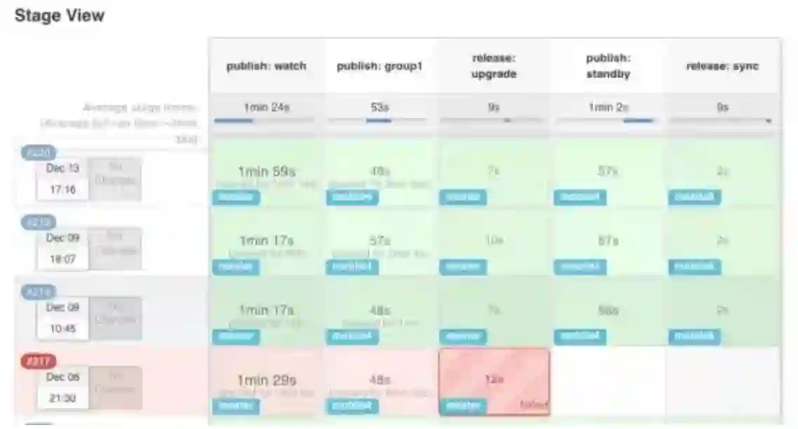 后来回头看,Frigate 虽然没有使用容器,但其实是实现了容器编排的很多功能。Frigate 发布的截图如下,这是基于 Jenkins Pipeline 的。