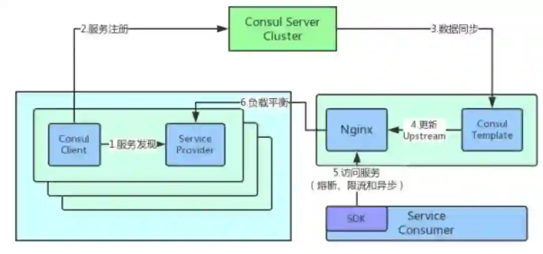 我们的服务注册和发现是基于 Consul 的,负载平衡是通过 Nginx 实现的。下图是整个服务注册和发现的过程: