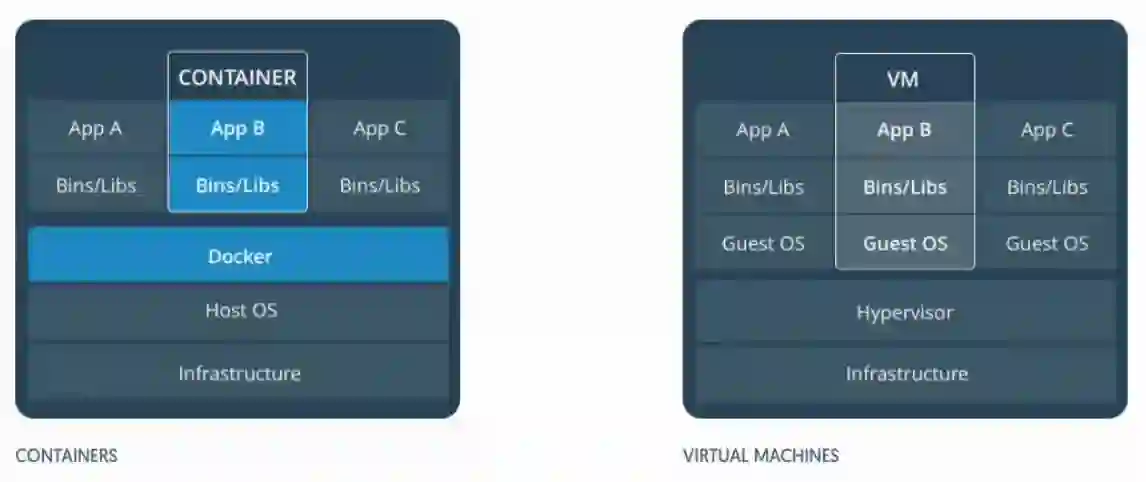 容器能做的很多事情,虚拟机也能做,那它们有什么区别呢?下面这张图是 Docker 官网的截图,很好的说明了两者的区别。