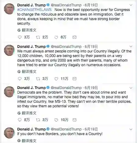 周二(19日),川普连发四条推特,声明边境政策对于一个国家多么重要:要经常逮捕那些非法潜入美国边境的移民。无论是非法移民儿童,还是父母。