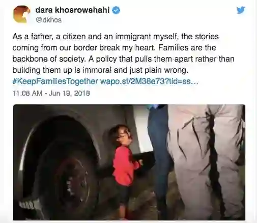 同样用了“让家庭在一起”的标签的还有 Uber CEO Dara Khosrowshahi。他说,作为一名父亲和移民,这个来自边界的故事“伤了我的心”。这样的分离政策,是不道德的,也是错误的。