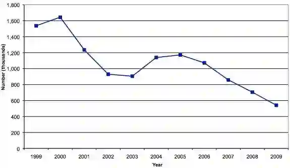 上表格是从 2008 年美国国土安全部移民统计年报中获取的。显示自 2005 年来,西南边境被拘留的人数明显呈下降趋势。当然,这可能既体现了非法移民入境后被拘留数量的减少,也可能跟边境执法人员的宽松执行有关。