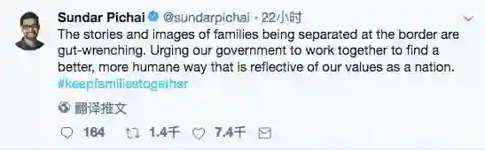 谷歌CEO Sundar Pichai 发推特说:边界分离的家庭故事和图片,令人“痛不欲生”,我们的政府应该采取一种更人道、更好的方式来应对。甚至,他还用了#让家庭在一起的标签。