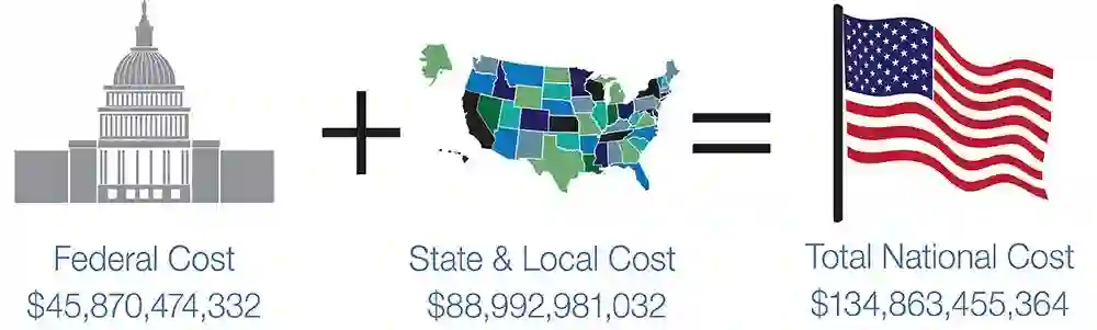 根据非营利组织 FAIR 的数据,从联邦到州,到地方政府层面,纳税人掏出了大约 1349 亿美元,用于支付超过 1250 万非法外国人和约 420 万非法外国人的公民子女带来的费用。平均为一个非法移民支付的费用大约在8000美元,包括了教育、医疗、司法、福利等多类开支。