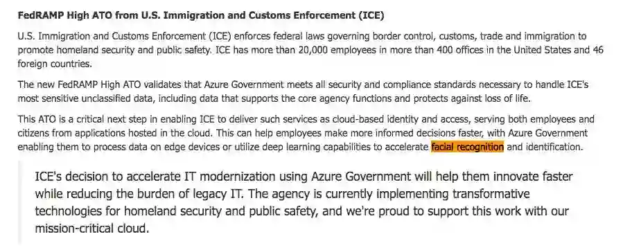 今年1月,微软在官方博客上宣布了与美国移民和海关执法局(U.S. Immigration and Customs Enforcement,简称 ICE)合作,微软通过政府云服务(Azure Government)跟 ICE 合作。比如,能够让执法局员工决策更快,更好地处理数据,或者利用深度学习功能加速面部识别和身份识别。
