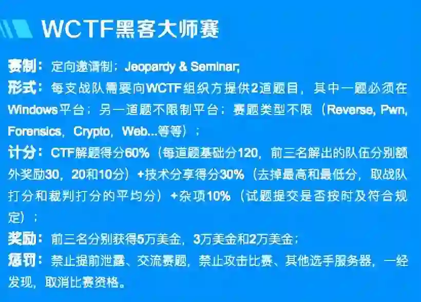 Vulcan 团队负责人 MJ 解释,WCTF 大师赛的亮点就是难度高,奖金也高,并且对出题的质量要求也很高。在邀请过程中,有些实力很强的队伍其实是可以空出来3天时间来参赛的,但由于没有足够的精力来准备出代表自己水平的题目,最终放弃了参加比赛。