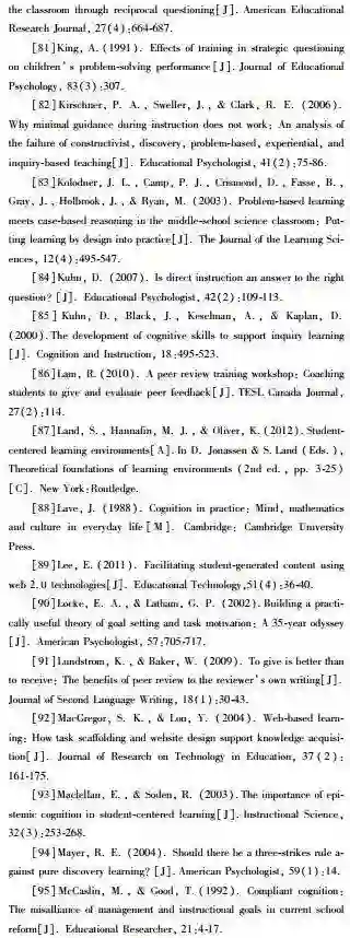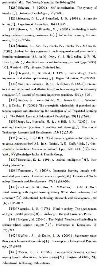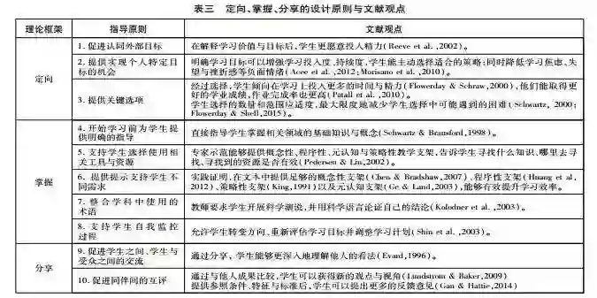 在生本学习中,教学支架对学生的成功至关重要(Raes et al.,2012)。许多学生,尤其是缺乏相关背景知识或学术经验的新手,需要明确的教学支架帮助他们掌握基本概念、作出决策、鉴别学业是否进步并应对紧急情况的挑战。教学支架能够帮助学生明确学习意义并付诸努力,帮助他们树立学习目标,努力完成目标并监控学习进度,在原有经验基础上掌握学习内容,最终建构并完善学习成果(Hannafin et al.,2009)。生本学习的教学支架可以以不同方式组织,包括提出探索性问题、同伴反馈、结构化解决方案、显性信息以及逐步指导等(Azevedo & Hadwin,2005;Brush & Saye,2000;Sharma & Hannafin,2007;Weigend,2014)。