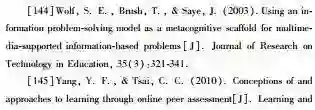 已有研究证明,学生通常缺乏查找与使用资源的经验(Hill & Hannafin,2001)。因此,他们独立查找使用网络资源无法保证准确性与可信度;无效无用的策略会妨碍学习甚至让学生遭遇挫折。进一步说,在开放学习环境中,许多学生无法从电脑上获取有益学习的帮助(Clarebout & Elen,2006;Oliver & Hannafin,2000)。专家型教学支架能够提供程序性、概念性、元认知与策略性等帮助,指导学生寻找什么、到哪里寻找、资源是否有效、是否有助于学习(Pedersen & Liu,2002)。专家(如老师、图书馆管理员等)同样能够提供专业的行动指导,让学生了解容易忽视的思维步骤(Collins et al.,1991)。当学生与专家一起工作时,学生就有机会直接观察专家如何用语言表达思想。