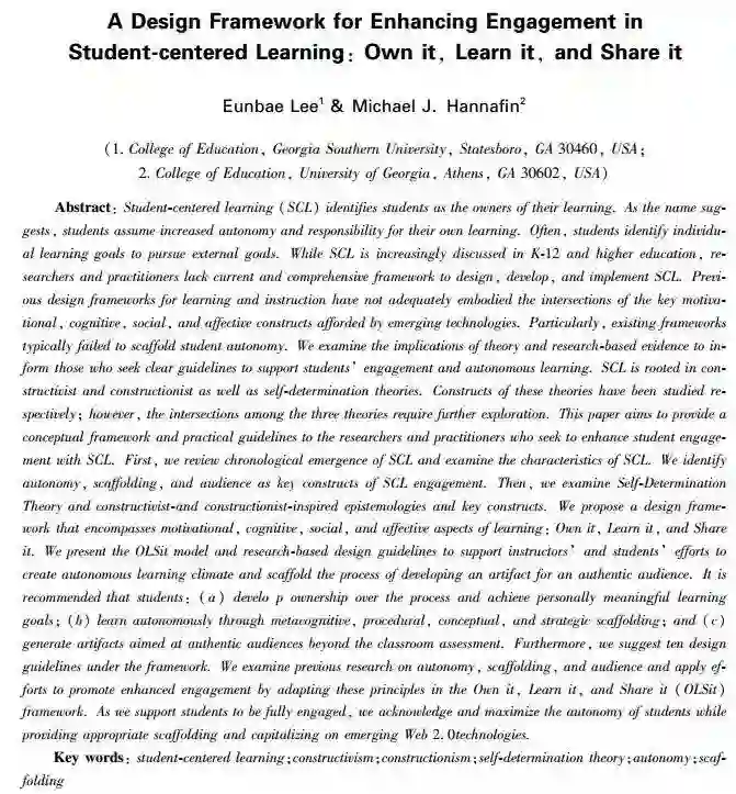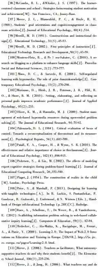 生本学习理论框架的出现可以追溯到20多年前。格拉宾等(Grabinger & Dunlap,1995)提出促进积极学习的丰富环境(the Rich Environments for Active Learning)模式,增强学生定向掌控、促进学生开展多维高阶思维活动、最终表述或展示学习成果。凯西(Casey,2013)也提出生本学习框架,关注学习的社会性,鼓励学生通过社交媒体相互支持,激发学习热情。凯勒(Keller,1987)的ARCS(attention,relevance,confidence,and satisfaction)学习模式提供了动机设计方法,可系统提升学生的注意力、相关性、自信心及满足感。随着新兴技术的涌现,学习过程的四个关键因素:动机、认知、社会交往与情感的相互作用不断增强,而早期的教学设计框架并不能涵盖这几方面;如何使用教学支架支持自主性学习,现有的设计框架尤为欠缺。