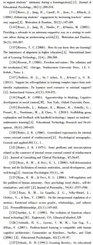 自我决定理论帮助我们理解学习活动中自主性是如何产生的。瑞安等(Ryan & Deci,2000)提出,内部动机激励人们努力拓展能力,通过自主行为本身获得满足感。内部动机激发的活动有这样的特征:人能够在活动中找到乐趣,即使没有外在压力或奖励激励,人们也愿意从事该活动。在学习上学生如果受到内部动机激励,会倾向于自主设置目标、理解任务要求、获得新知识、发展个体能力;这些自主行为能够帮助学生进行个性化、具有个体价值的深度学习。树立内部学习目标的学生,比那些为完成外部目标、希望得到老师认可或仅为了避免惩罚的学生,展现出更强的学习自主性(Meece et al.,1988)。