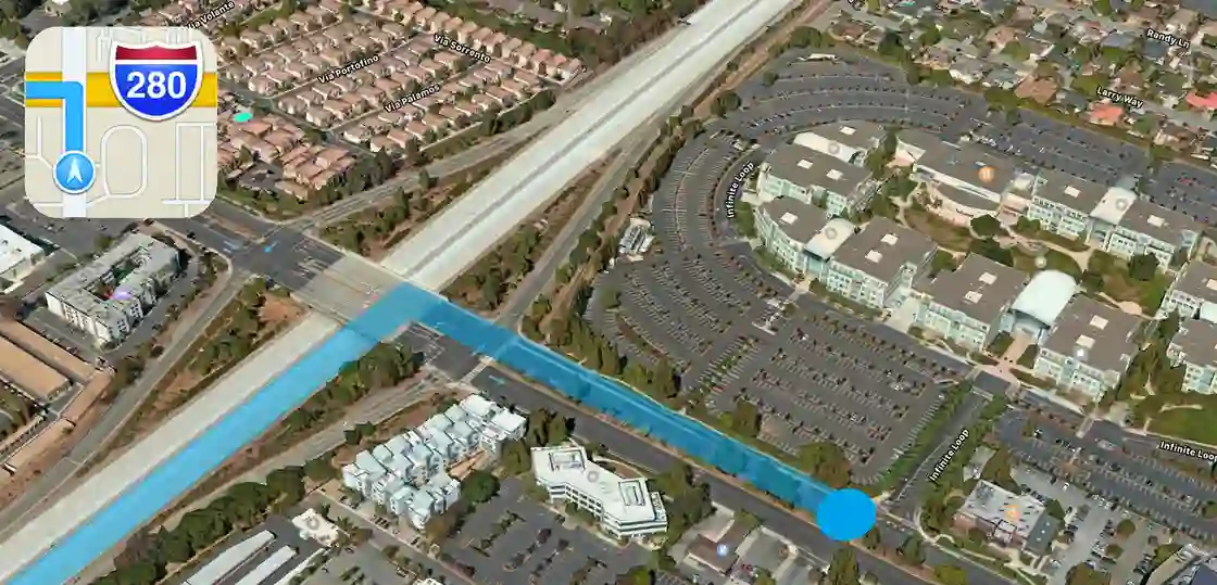 光看图标也不难看出这并不是一个十字路口,出门就翻车,被网友认为是对苹果地图精确度差的最好吐槽。在 iOS 7 版本中,图标直接换成从 Apple Park(新总部)出发,这枚图标在当时暗示了新总部的位置。由于新总部现已落成,iOS 11 版图标直接画出了 Apple Park 的一角。