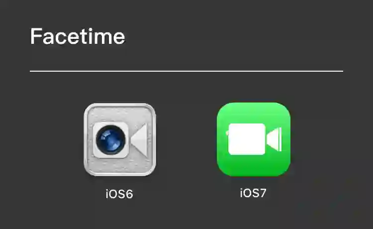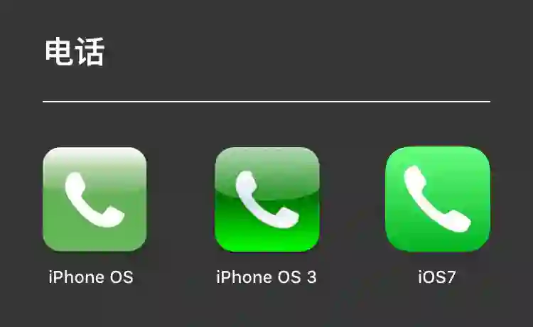 iPhone OS 3 为一些系统应用图标加入了条纹背景,并且一直沿用到 iOS 6,电话当然也在其中。但在后来的扁平化潮流中,电话图标又回归了最初的质朴。