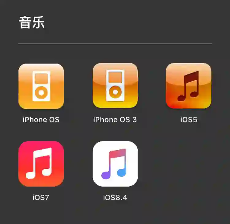 iOS 最纠结图标第二名。2007 年,乔布斯以 Internet Communicator + Phone + iPod 的概念介绍了第一代 iPhone,其中的音乐功能理所当然被称之为「iPod」,图标也是一台 iPod。在 iOS 走过四代之后,终于正名为「音乐」,并开始变色之旅。伴随 iOS 8.4 而来的 Apple Music 再次改变了图标配色,保持至今。
