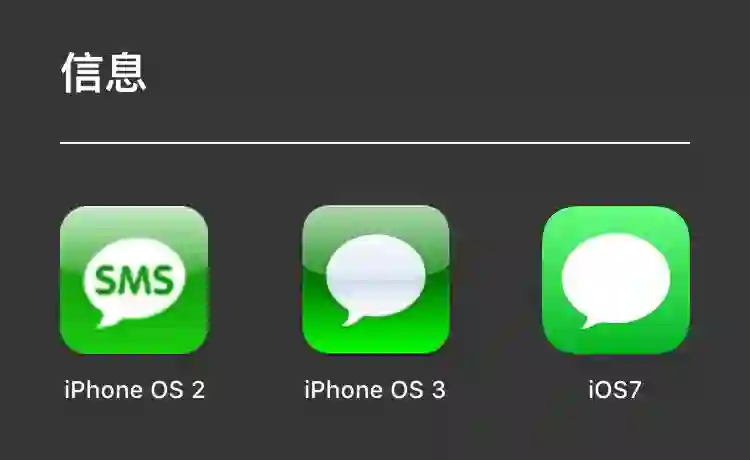 同样被加条纹背景的还有信息应用。在 iPhone OS 3 之前,信息图标的气泡中有「SMS」(Short Messege Service)字样。随着 iPhone OS 3 支持了彩信(MMS)服务,去掉了 SMS 字样,应用名称也从「Text」变成了「Messages」,气泡涨大了一圈。之后 iOS5 有了 iMessage 功能,但并未对图标造成任何影响。下次改动是在 iOS 7 版本中又大了一圈,十分膨胀。