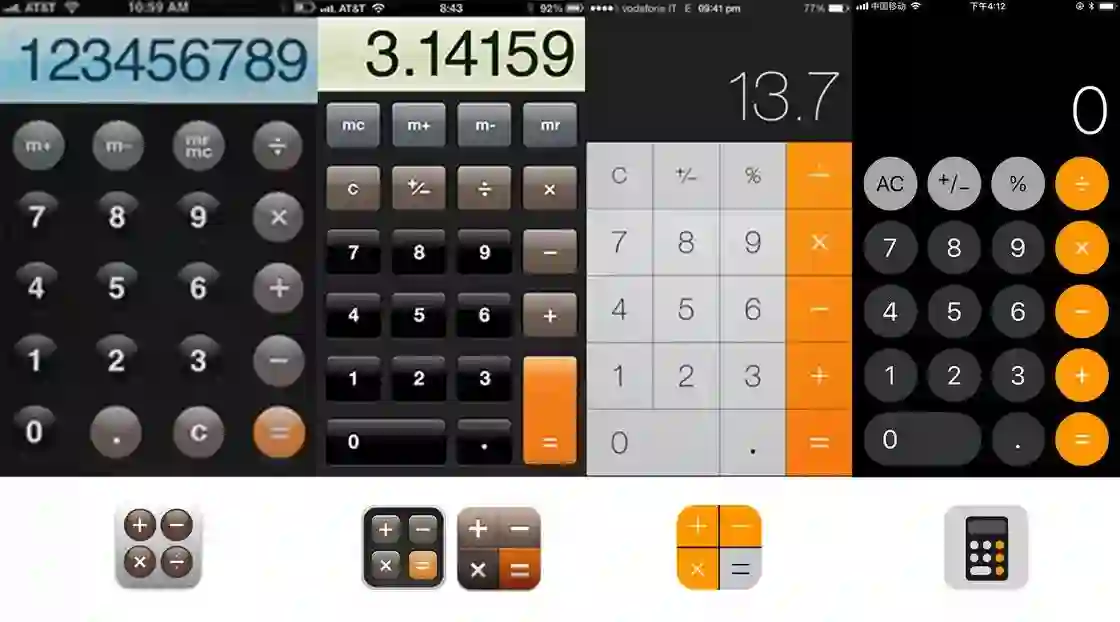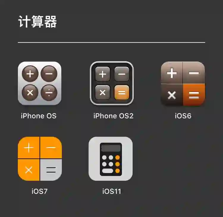 iOS 最纠结图标第一名。计算器图标一直对应其 UI 风格,应用里什么样子,图标就是什么样子。