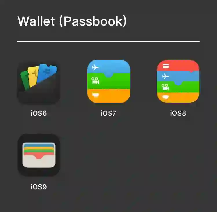Wallet 的前身是 Passbook,一款票券聚合应用。随着 Apple Pay 的加入,iOS 8 中的 Passbook 图标多出了一个银行卡标识。在 iOS 9 中正式进化为 Wallet,图标也修成正果,彻底变成一个钱包。