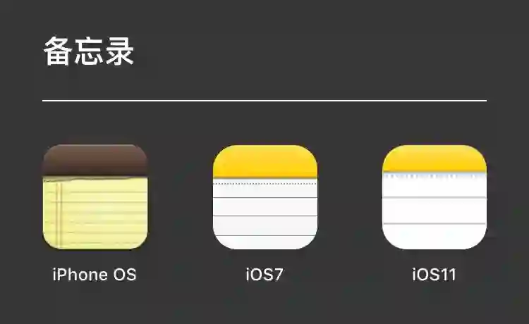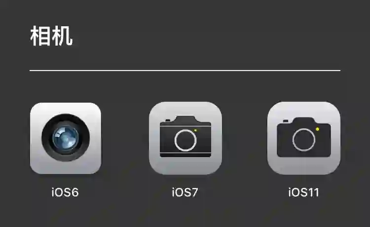 相机图标从 iPhone OS 到 iOS 6一直在做很小的细节调整。iOS 7 版本没有像想象中那样拍扁这颗镜头,而是拍出一个单反相机来。但实际上,iOS 7 版图标中包含一些光影细节:两根细线以及中间的圆环,小黄点都有不一样的阴影效果。实在佩服苹果的细节,虽然我们一直以为它是纯平的。iOS 11 版中的相机图标减少了一些细节,更圆润。