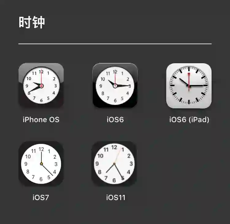iOS 最土豪图标得主。扁平化之前,时钟图标也经历了一些光线细节调整,其主图案一直没变。但 iOS 6 的 iPad 版本图标绝对是一个异类,这也是时钟应用第一次来到 iPad。其设计照搬了瑞士联邦地铁的钟表设计: