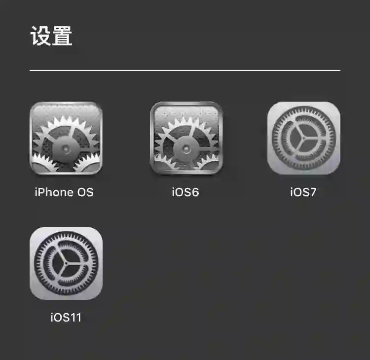 设置图标也经历了光影细节调整,在 iOS 6 中齿轮的齿变得圆润了一些,这也是第一个能在手机升级中转动的齿轮。iOS 7 版本变成了套圈的齿轮,iOS 11 版本的黑色部分更深。