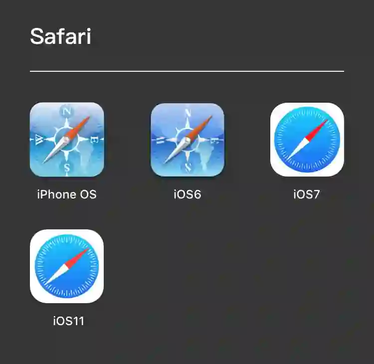 Safari 图标在 iOS 11 中,指针的角度发生了微小的变化,对于此有许多猜测,比如地球磁场说:现实地球中的地磁北极也在持续的发生变化,在过去的 150 年里向北移动了超过 1000 公里;3D 指针说:将新旧两个图标摆在一起,用肉眼将两个图标叠在一起会有一种 3D 的感觉……