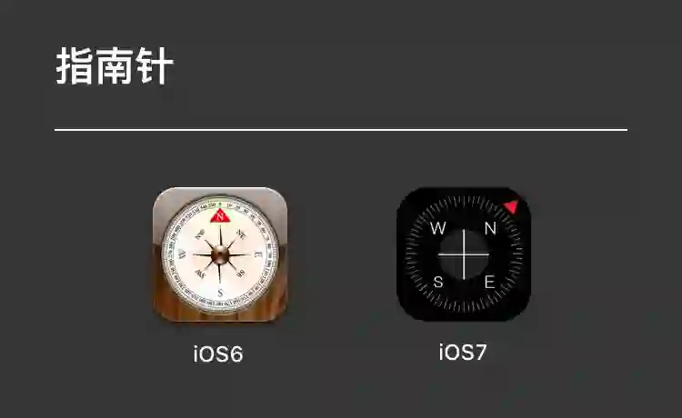 指南针是 iPhone OS 3 的新功能之一,且 iPhone 3GS 之前的机型是无法使用的。精致的图标一直沿用至 iOS 6。跟随 iOS 7 一起拍平之后,指南针应用加入了水平仪,海拔,量角器等功能,但其图标和名称没有发生改变。