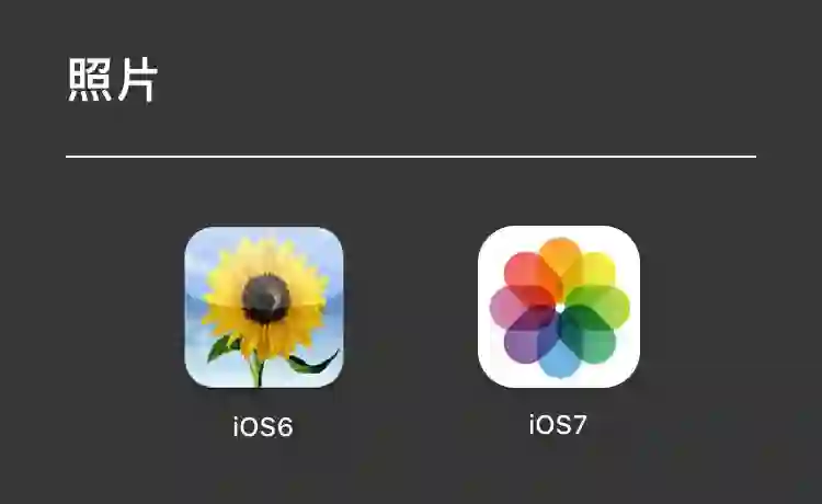照片图标背景的天空从 iPhone OS 到 iOS 6 一直发生着微妙的变化。iOS 7 版本沿用至今,应该算是抽象版向日葵吧。