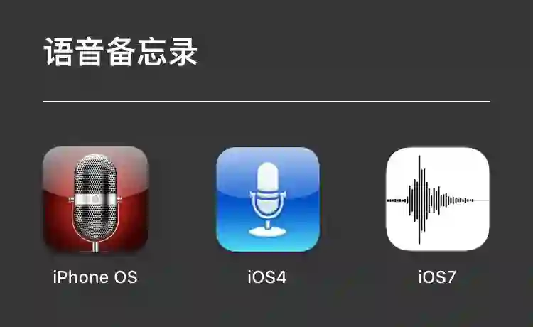 语音备忘录同样也是 iPhone OS 3 的新功能,图标中的话筒与界面中的话筒相同。iOS 4 版本提前拍扁了图标,但界面仍然是一只拟物的话筒。iOS 7 版本图标则直接变成波形图像,录制界面也由话筒改为了实时波形图像。