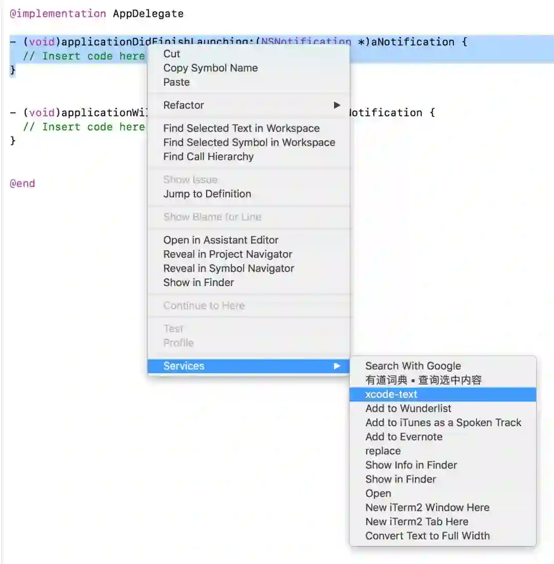 所有创建保存之后的 service 都会自动保存到 ~/Library/Services/ 目录下,一旦保存我们就可以在应用的 services 目录下看到我们的目标,比如我保存 xcode-text.workflow 之后。我在 Xcode 中选择某些代码,右键就可以看到我所创建的 service 了,如图: