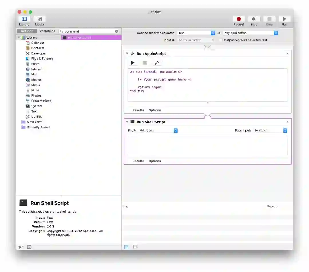 首先通过 Spotlight Search 启动 Automator,启动之后选择创建 Service。之后可以看到所以支持的 action,选择 Run AppleScript 并拖动到右侧的 workflow 区域,即可执行某个 AppleScript 了。当然也可以拖动 Run Shell Script 到 workflow 区域,各个 action 之间可以通过 stdin 传递数据。如下图所示: